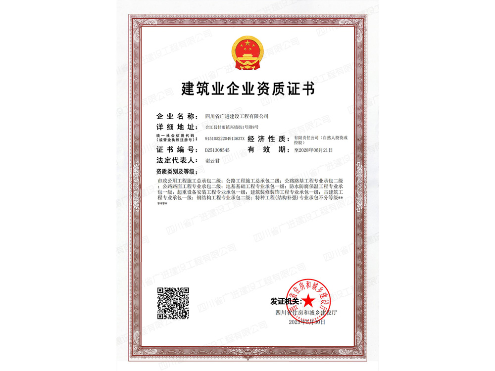 目前,公司建筑工程施工總承包資質(zhì)已升級(jí)為壹級(jí)資質(zhì),公司有職工280余人,有職稱人員113人(其中高級(jí)職稱3人、中級(jí)職稱32人、初級(jí)職稱78人);各類管理上崗人員40余人;大中專學(xué)歷85余人;高中專學(xué)歷120余人。企業(yè)法人代表兼總經(jīng)理:謝云君,注冊(cè)資金壹億伍仟萬元,下面設(shè)有一個(gè)分公司“四川省廣進(jìn)建設(shè)工程有限公司赤水分公司”,分公司地址:貴州省遵義市赤水市太平街。
